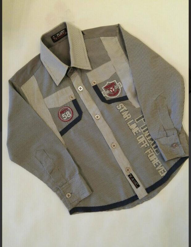 Рубашка для мальчика . Состояние отличное, но есть нюанс : разошлось немного по шву {последнее фото о}. Размер указан 104. Замеры : ширина 36, длина 42, рукав 38. Возврата и обмена нет.