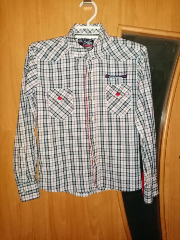 Рубашка-122-128см-в отличном состоянии,на кнопках-очень удобно.Качество супер. Длина по спинке-50см,плечи-33см,рукав от плеча-48см,под мышками -38см. Спрашивайте,ответу на любые вопросы.