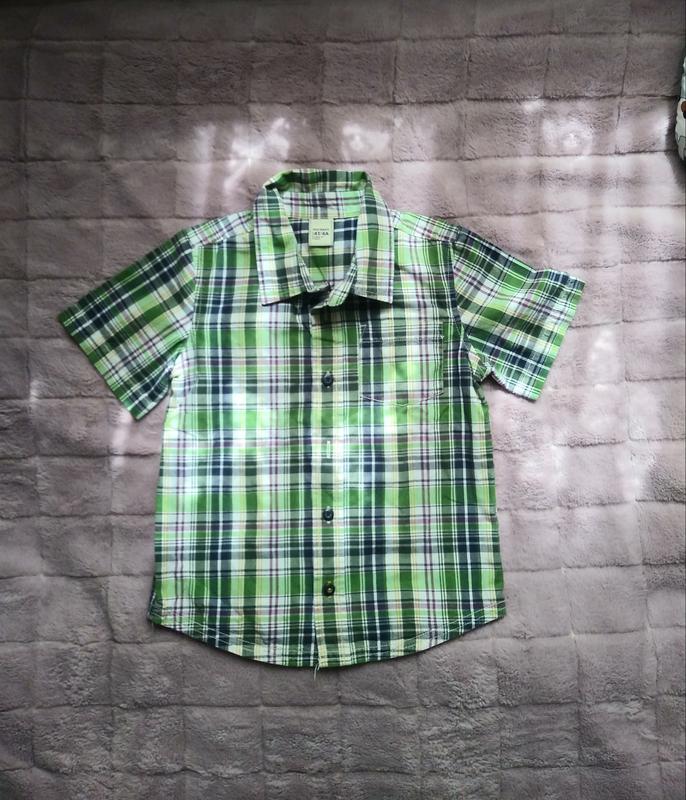 Классная качественная рубашка на мальчика 3-5 лет. 100% качественный хлопок, состояние идеальное, без затёртостей, дефектов. Необычно красивая расцветка в зелёном тоне. Замеры: плечи 28.5 см., пог. 34 см., длина по спинке 44 см.