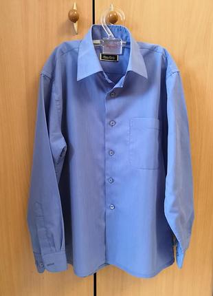 Рубашка на мальчика 9-10 лет. На бирке указан размер 32. Длина по средине спинки 57 см, длина по боковому шву од подмышки вниз 34 см, плечи 37 см, полуобхват груди 43 см, рукав от плеча 46 см.