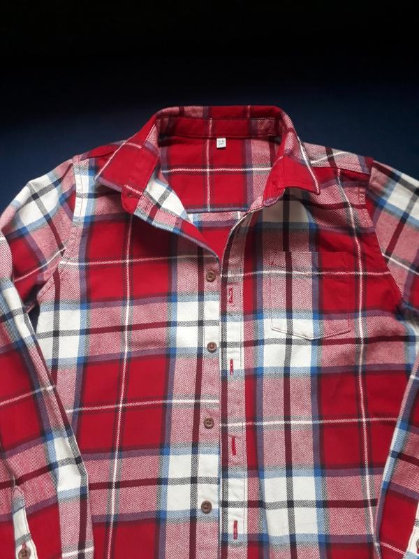 Стильная рубашка на мальчика 100% котон ( плотный) Замеры: Ширина плечи 36см, грудь 43см, низ 44см Длина по спинке 61см, Длина рукава 56см Состояние отличное, без дефектов.
