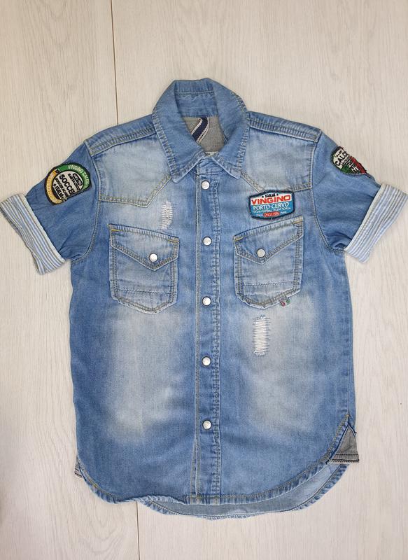 Джинсова сорочка з нашивками і подворотами на рукавах
