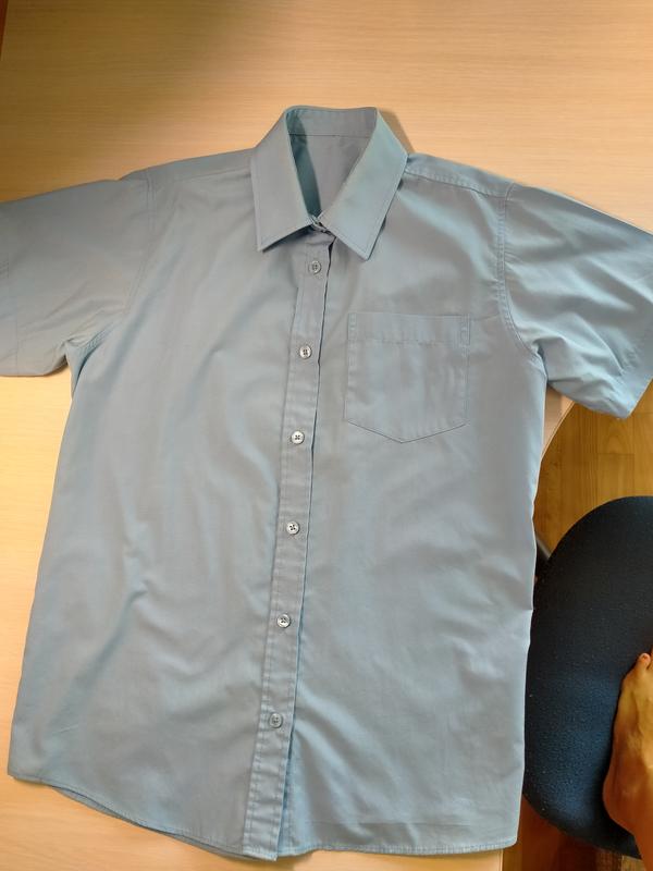 Рубашка голубого цвета с коротким рукавом, в очень хорошем состоянии, написано 12-13 лет. Длина 66 см, ширина плеч 37 см, ширина рубашки 49 см