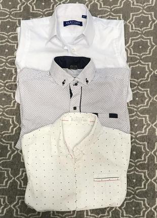 Ідеальний набір для першокласника. Сорочки у відмінному стані, з довгим рукав одягнута один раз. З довгим рукавом: рукав 39, довжина від плеча 45, пог 30. Біла в горошок: довжина 41, пог 31.Синя з коротким рукавом: довжина 42, пог 31. Продаю одним лотом. Окремо ціна 150 грн
