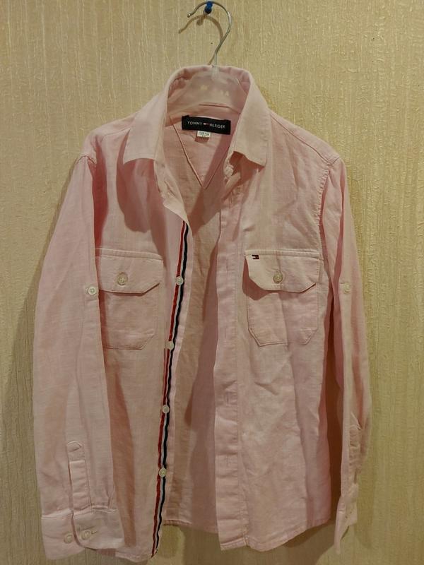 В очень хорошем состоянии розовая хлопоковая рубашка. На бирке 128-134, но маломерит. Будет хорошо на 122-128р и на неплотного ребенка. Рукав можно подвернуть - есть пуговки.