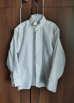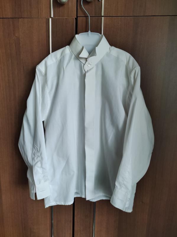 Рубашка на Перше вересня. біла, з довгим рукавом, має цікавий воротнік для бабочки і закриті гудзики. Розмір вказаний 11 1/2. Розміри: пог 37, довжина 45 см, довжина рукава 39, по манжети 7 см.