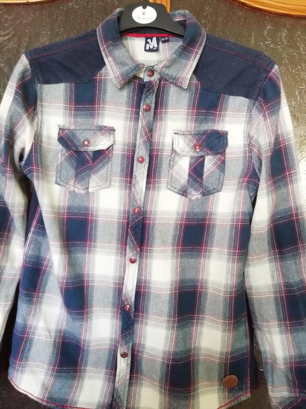 Рубашка в хорошем состоянии, кнопки рабочие. Спинка трикотажная. 100% хлопок. ПОГ- 45, длина - 64 , рукав - .58, плечи 38. Из недостатков - на некоторых кнопках облезла краска, на фото видно.