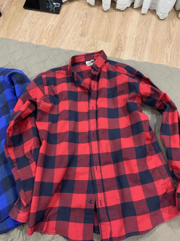 Сорочка в клітинку . Є у двох кольорах . Червона більша на ріст 146, синя 140