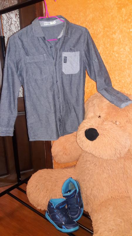 Рубашка известной фирмы Glo-story мальчику на рост 140см. Ньюанс на 4 фото,заштопано.При застегнутой пуговицы 100% не видно.(фото 5) Длина 58 Пог 44 Плечи 37 Рукав от плеча 49 От горловины 59