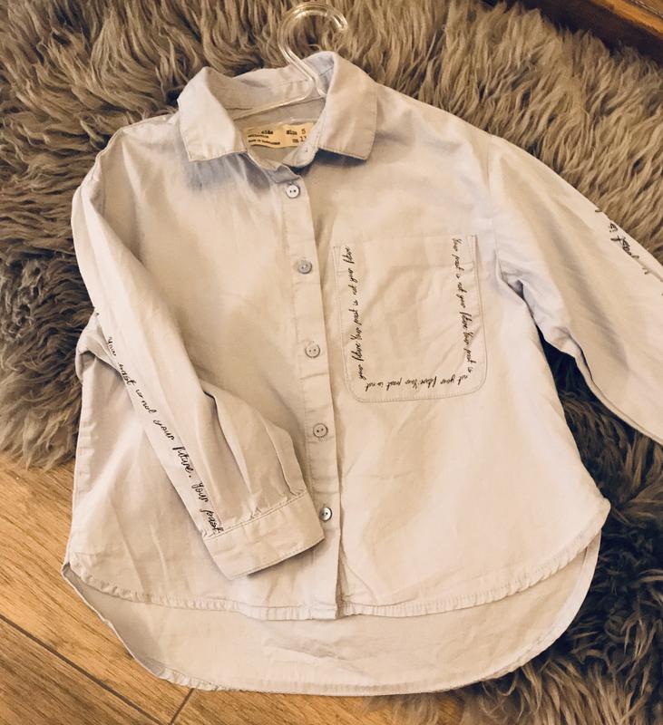 Крута сорочка на хлопчика або дівчинку. зад подовжений, ізюминку додають написи. Вказано 110, реальний вік 3-4р. Колір блакитний, як на другому фото. Склад 100% бавовна.