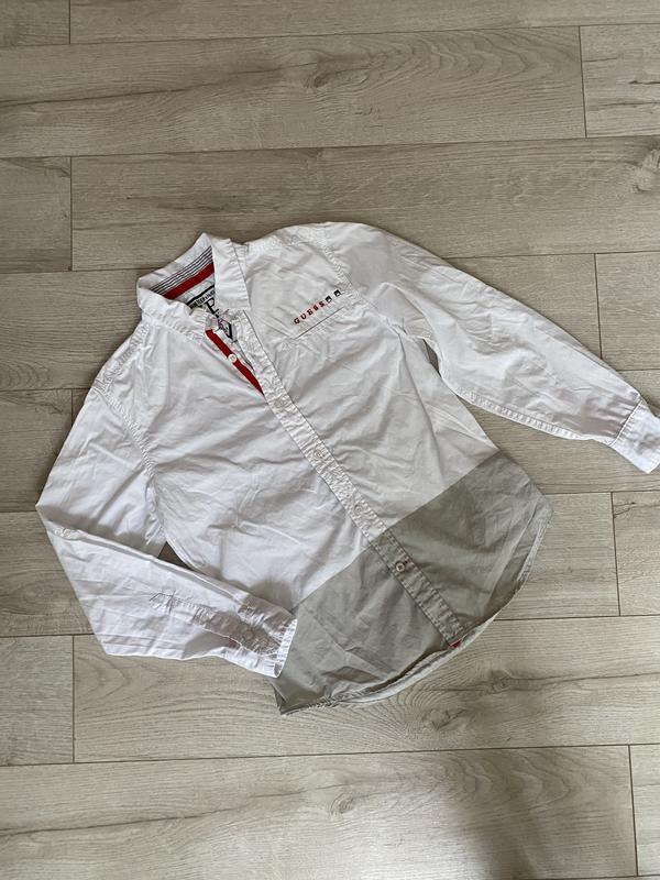 фото на теле нет Застёгивается на пуговки Белая качественная рубашка брэнда guess с брэндовым декором Не тягучая Плотность средняя Рукава подворачивать можно в летний вариант Подойдёт на 9-11 лет ориентируйтесь по замерам Длина 58-60 см) Плечи 38 см) Рукав 54 см) Пог 45,9 см) Пот 44 см) Снизу 44,7 см)