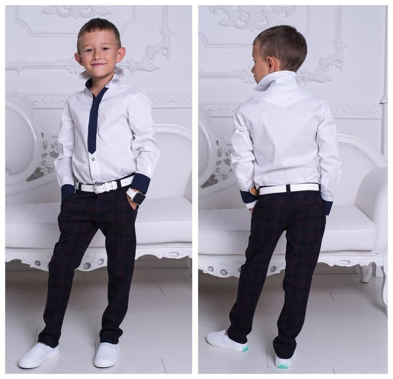 Рубашка - галстук арт. **** 920 Ткань: турецкая рубашечная ткань (100% хлопок) Манжеты на рукавах, внутренняя сторона воротника и имитация галстука отделаны синей рубашечной тканью, высокое качество пошива Рост: 152-158 Цена дроп/опт: 325 грн