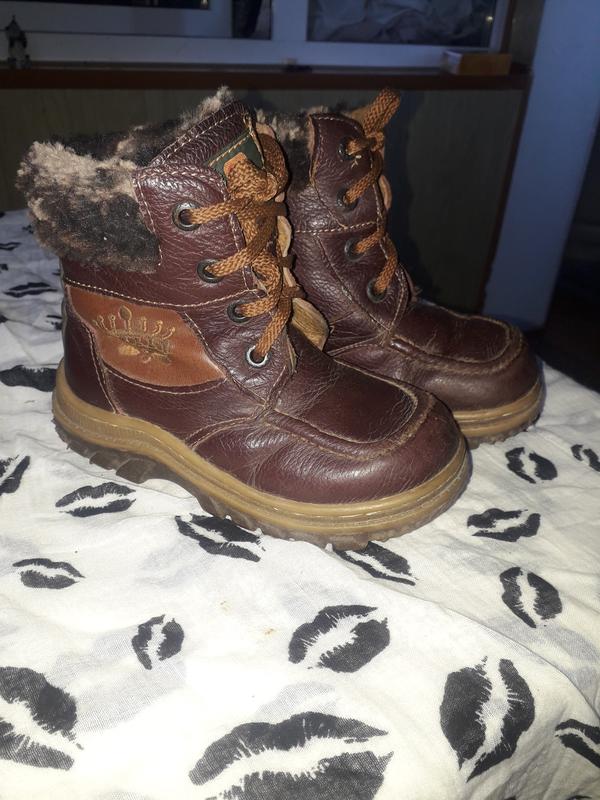 Міцні сапожки на шнурівці, шнурки трохи довгі. Верх з натуральної шкіри Всередині тепла підкладка Підошва ціла та має дуже виражений рельєфний малюнок ,не будуть слизькими Розмір вказаний 30, але трішки маломірять. Устілка 18 см Підошва 2 см Висота по боку 11 см
