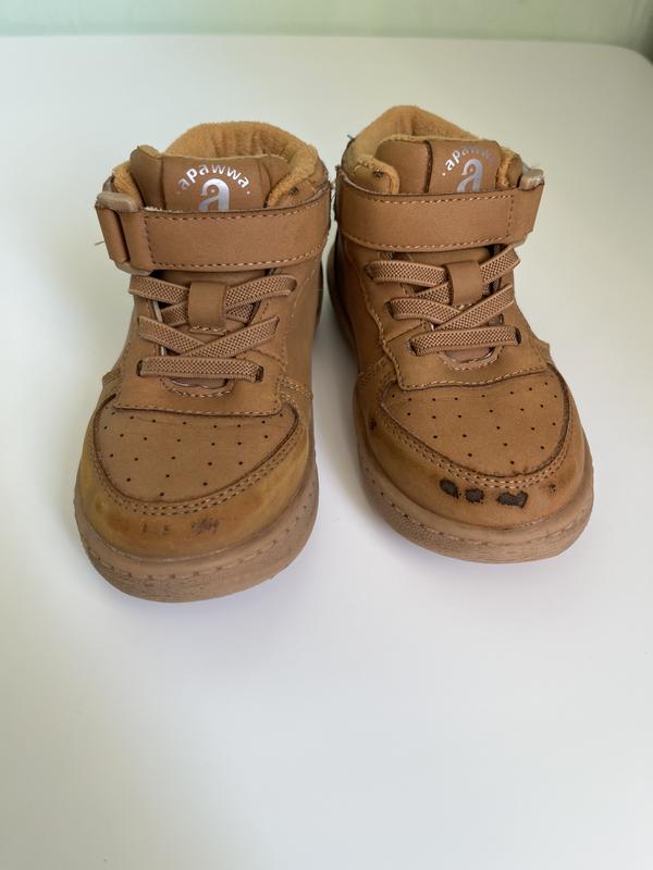Ботинки деми от apawwa. Эко кожа, внутри утеплены флисом, анатомическая стелька, легкие и очень гибкие. Размер 25- стелька 15,5см. Носилы один сезон, но активно. Счесанные носки (видно на фото), все остальное в норме.