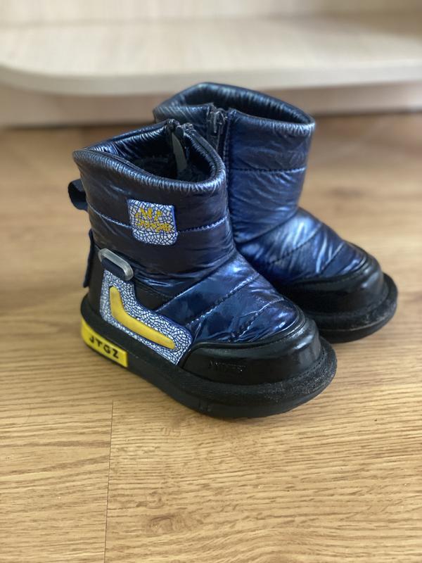 Дутики синего цвета в 22 размере. По стельке - 13 см. Имеют потертости