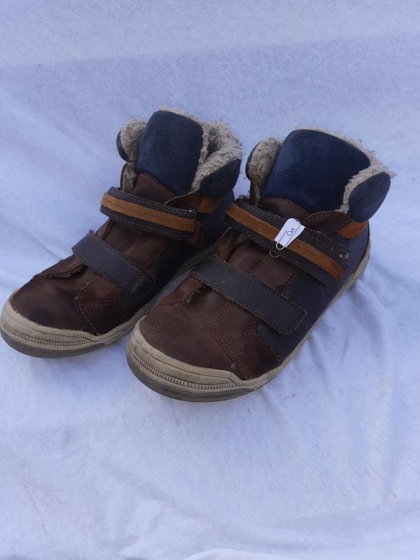 Продам удобные и теплые зимние ботинки для ребенка. Модель выполнена в практичных коричнево-синих тонах, что делает их устойчивыми к загрязнениям. Высокая подошва и меховая подкладка обеспечат комфорт даже в морозную погоду. Основные характеристики: Размер: 34 (длина стельки около 21.5–22 см). Застежка: двойные широкие липучки, которые позволяют ребенку быстро обуваться самостоятельно и надежно фиксируют ножку. Утеплитель: густой искусственный мех (цигейка) по всей внутренней поверхности. Подошва: прочная, с антискользящим рельефом, устойчивая к износу. Материал: комбинация эко-кожи и плотного легко чистящегося текстиля.