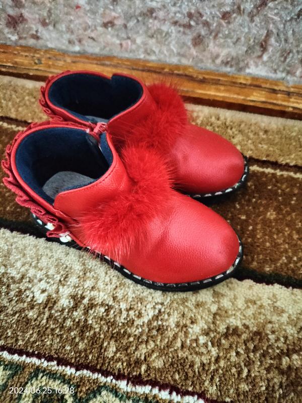 Демосезонные ботиночки утеплены флисом, декорированы мехом и жемчужинками; длина стельки 15 см. Цвет спокойный красный( камера немного доказывает).
