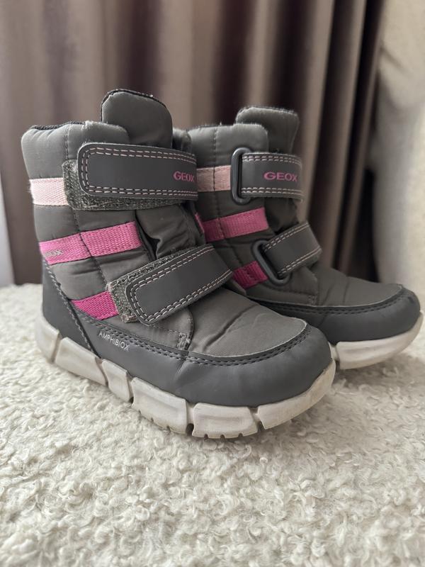 Фимовые зимние дышащие ботинки сапожки зима.Стан отлично единственное что на одном спереде есть чуточку царапните и как носить особенно не видно Не промокают.Есть дополнительная ортопедическая стелька (отдельно выполненная).Фирма Geox особенно не нуждается в рекламе, кто хотя бы раз пробовал понять