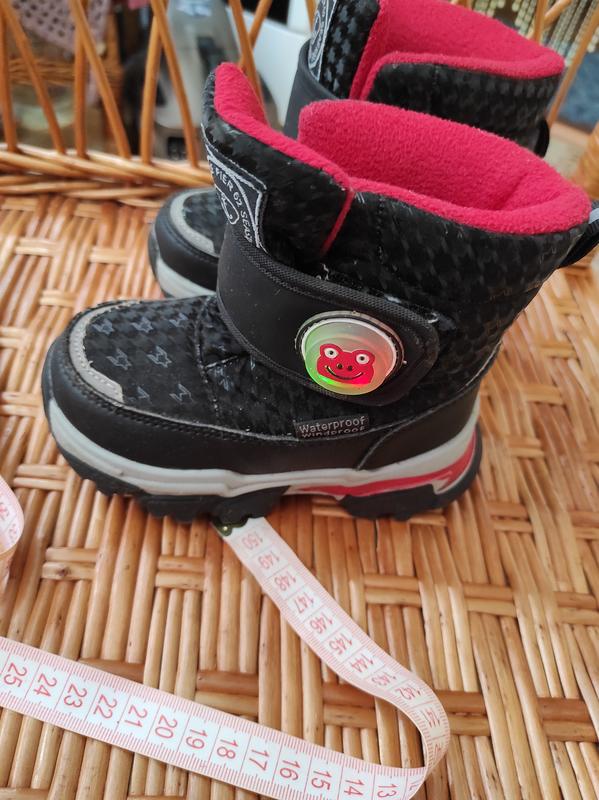 Очень теплые (температурный режим до -25), удобно одеваются, не промокают, красиво моются/выбираются, не скользят, если гололедица, внутри не стоптани.. просто очень классные сапожки, мы были очень довольны и на эту зиму выбирать такую же модельку. У нас широкая ножка потому они хорошо подходят для ножки с высоким подъемом. Стелька 15,5 см. Например, у нас тогда была ножка 14 см - то запас 1,5 см идеально подобрался. Состояние почти идеально, на 4 фото показала небольшую царапку, которую в реале совсем не видно и на что ни влияет. Светятся, три режима подсветки. Купували за 1000. Будете довольны)