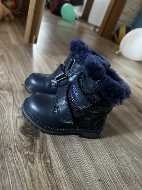 Новые,темно-синие, без дефектов, теплые, мех внутри, одели только раз,нога выросла