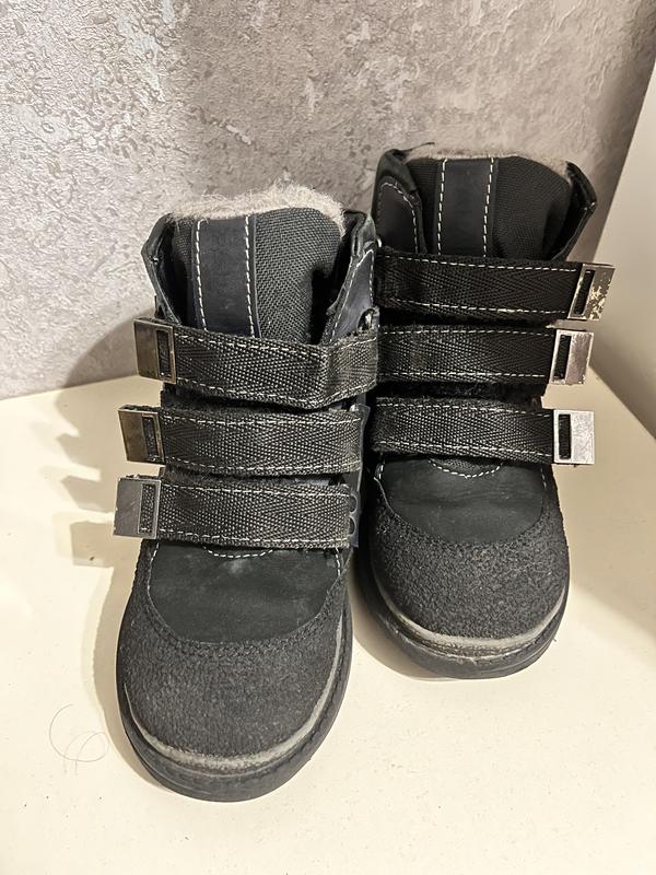 Детские зимние ботинки для мальчика. Застежка - липучка. В идеальном состоянии, верх натуральный нубук комбинированный с кожей, внутри натуральный мех. Украинский производитель -Polaris