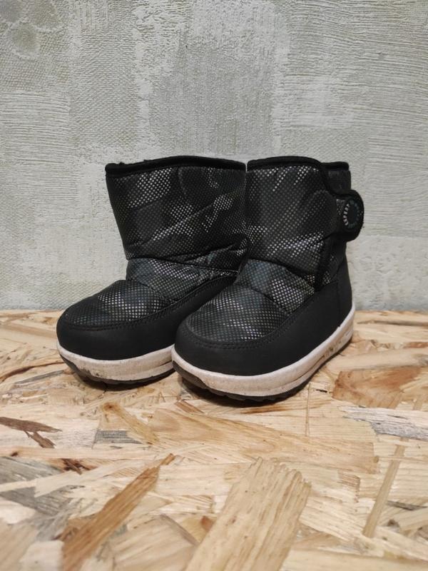 Дутики очень теплые не скользкие, переносили немножко,после одного ребенка, который только начала ходить.Размер 24.Куповали при 600 гн.Застежка липучка, подойдут на широкую ножку.Довжина стельки 14 см