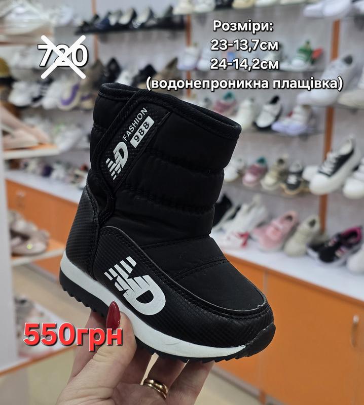 Детские зимние сапоги * Размер: Доступны два размера: 23-13,7 см и 24-14,2 см. * Материал: Верх сапог изготовлен из водонепроницаемой плащевки, что защитит детские ножки от влаги. Внутренний материал овчина. * Цвет: Черные с белыми вставками и логотипом. Классический и универсальный вариант, который подойдет к большинству зимней одежды. * Особенности: Водонепроницаемость – главное преимущество этих сапог. Они отлично защитят ножки ребенка от снега и луж. Застежка позволяет быстро надевать и снимать сапоги.