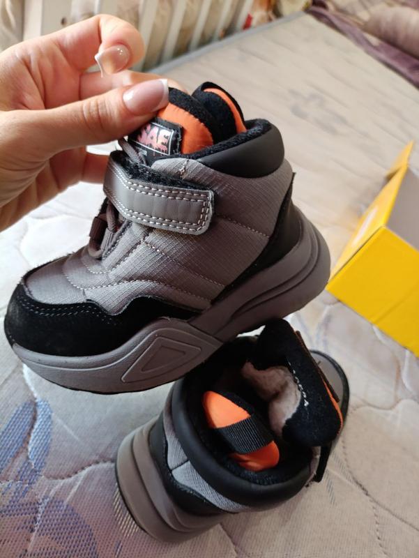 Детские зимние ботинки. Теплые и легесненькие. в середине что-то напоминает овчину. На левом ботинке есть небольшая потертость в области носка (пальчиков). ее можно запекать спреем для замши черного цвета.