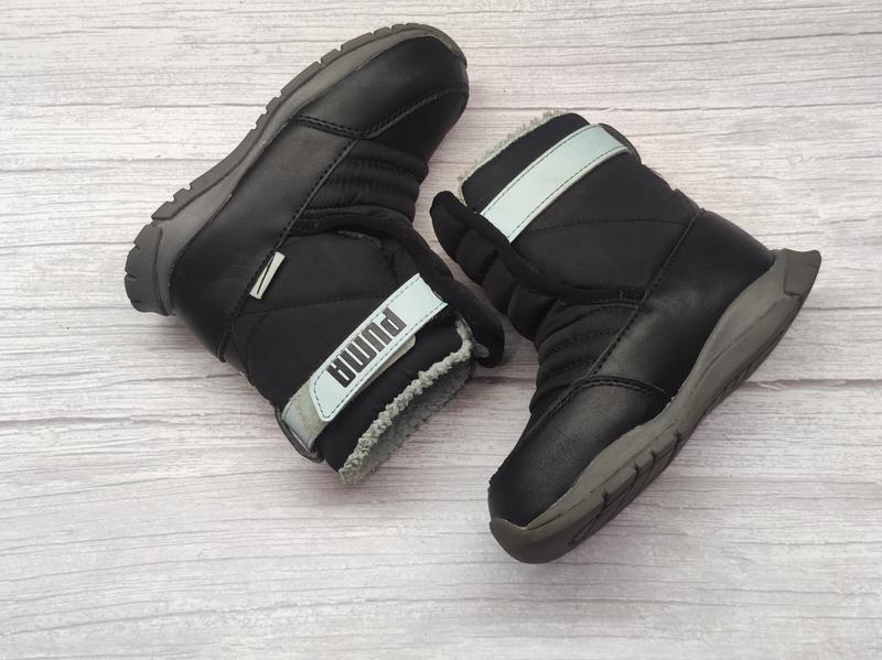 Дитячі зимові черевики з колекції Puma. Утеплена модель виконана з поєднання штучної шкіри та текстильного матеріалу. Фірмовий логотип Puma. Поєднується з будь-яким верхнім одягом. Особливості: Круглий, м'який носок. Застібається на липучку. Завищена халява. Гумова підошва. М'який задник. Рекомендації щодо догляду: Після кожного носіння просушувати взуття, уникаючи нагрівання. Використовувати вологозахисний спрей. Не рекомендується застосовувати продукти, які містять високий відсоток жиру або олії. Рекомендується хімчистка, якщо виробник не вказав інший спосіб чищення на виробі або упаковці. Зберігати взуття, використовуючи спеціальні вставки або папір для підтримки форми. Стан: На фото є що трохи нітки від ліпучки розпушились, але там все ціле. Розмір: 24 Дліна устілки: 15 см Пакування: Коробка (не орігінальна). Вже чисті і готові до експлуатації Торг
