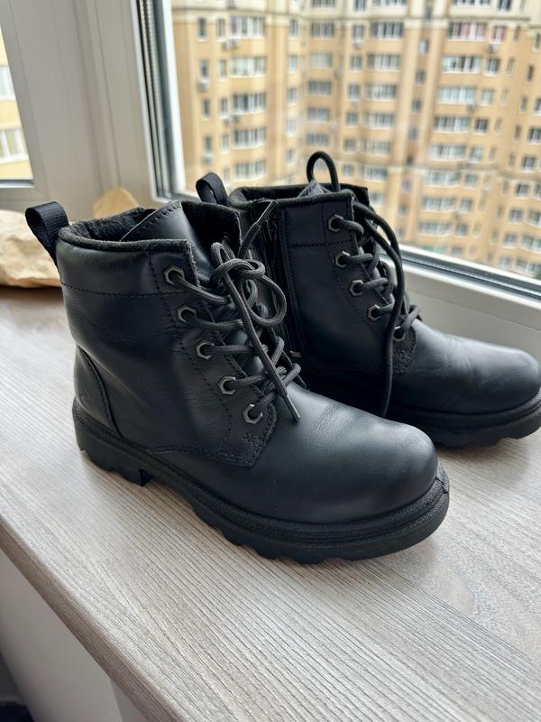 Черевики дитячі як на дівчинку так і на хлопчика Ecco Grainer. Купували в січні 2025 р в Інтертопі . Носила дуже мало і вони в дуже гарному стані без нюансів. Особливості :верх з цільнозернистої шкіри, підкладка зі штучного хутра поглинає вологу та не деформується , технологія waterproof, лита підошва FLUIDFORM, повторює вигини стопи та забезпечує легкість ходи , для помірного холоду . По підошві видно, що носили не багато , вона не стерта ні пята ні ніс . Розмір 32. Довжина устілки десь 20.5 см .