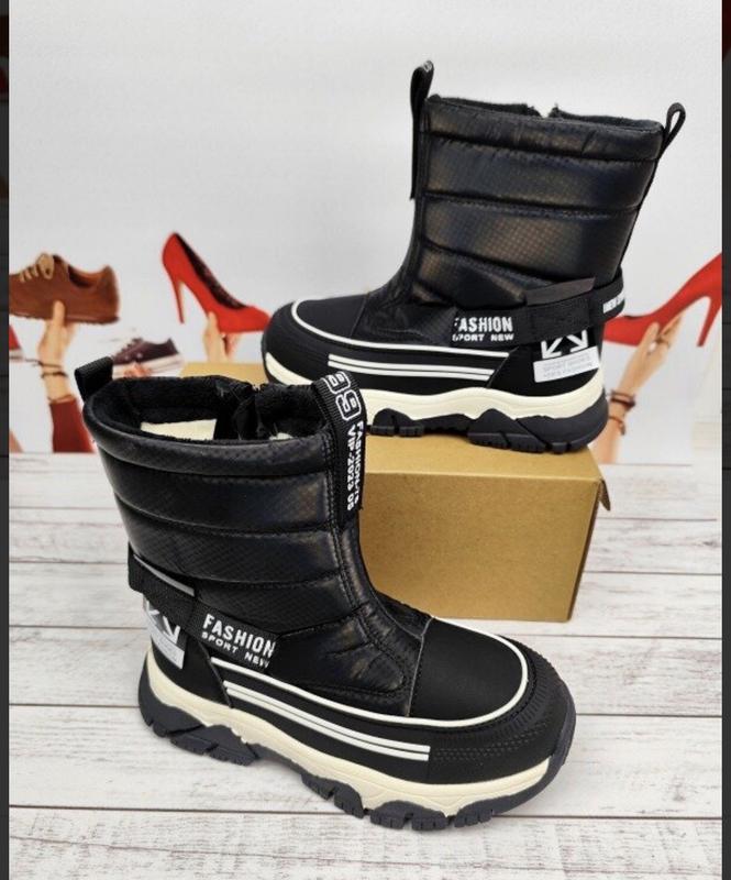 Дитячі зимові дутіки Розміри: 32-37 Заміри зроблені всередині: 32 р- 20,5 см 33 р- 21 см 34 р- 22 см 35 р- 22,5 см 36 р- 23 см 37 р- 24 см Можлива похибка +/- 1-2 мм. Матеріал верху взуття: Шкір.замінник+термоматеріал Внутрішній матеріал взуття: Штучне хутро. Тип застібки: Блискавка Колір: Чорний Підошва- Гума А6873 Мд