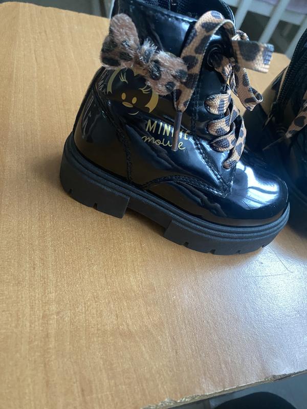 Стильні дитячі черевики чорного лакованого кольору з принтом Minnie Mouse на боці. Мають модні леопардові шнурки та масивну підошву Дуже легкі Розмір 22