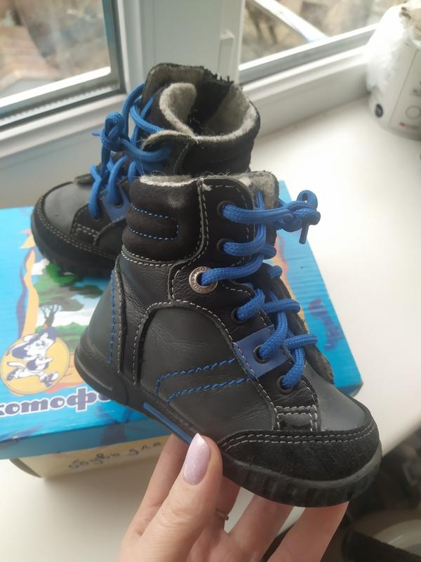 Ботинки Деми. Размер 21 стелька 13.5 см. Натуральная кожа , внутри шерсть байка. На молнии полнота регулируется. Состояние идеальное(бу).Фирма Котофей . описание и отзывы про ботинки можно почитать в интернете. у нас много обуви этой фирмы.