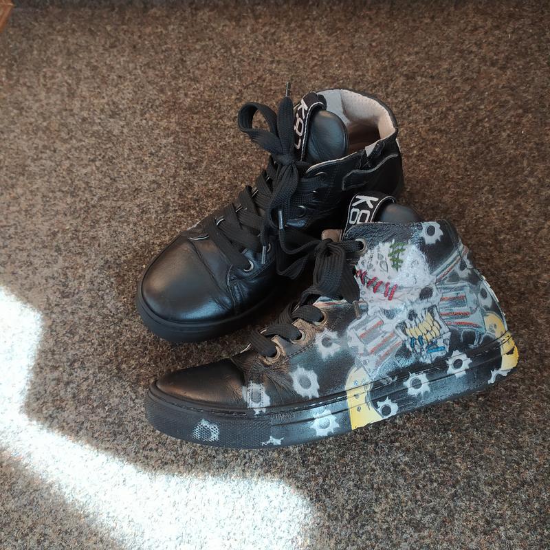 Черные осенние ботинки из натуральной кожи от Be Kool с черепками-36р длина по стельке-22.5см Стелька вынимная. Внутри тоже все кожа. Небольшие следы носки на носках-смотрите фото. https://galeotticalzature.com/en/children/5461-be-kool-boy-s-sneakers-black-leather.html