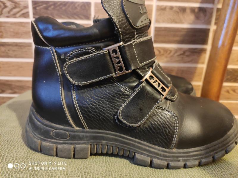 Шкіряні ботинки на хлопчика 34 розміру!!! Підошва міцна, стан гарний , окрім однієї потертості на лівому ботинку!!! Ботиночки зручні, міцні та комфортні!!! Дитина носила і взимку з теплим носком!!!