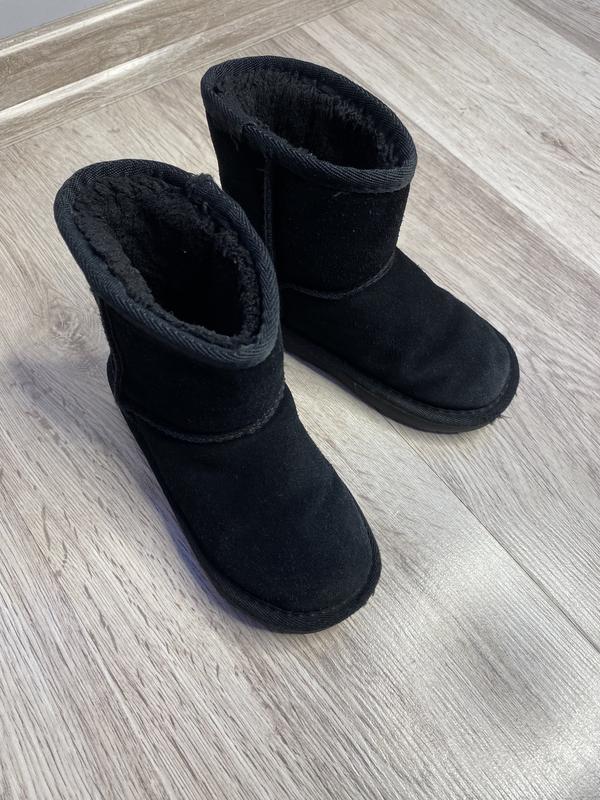 Чёрные детские угги, очень тёплые, под любую одежду. 17 см по стельке. Сверху натуральная замша, внутри искусственный густой мех. Как вариант можно подкрасить замш из баллончика краской. Состояние очень очень хорошее, оставила младшему сыну от старшего, но просто некуда складывать склады обуви.