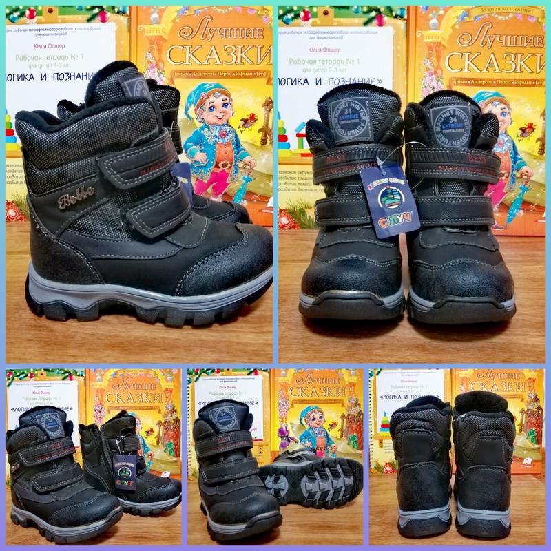 Відмінні зимові термоботинки для хлопчика. На ніжці виглядають дуже акуратно. Липучки добре фіксують ніжку. П'ята жорстка. Матеріал кожзам. Прорезинений носочок і п'ятка . Утеплені штучним хутром. Висока підошва 2.5 див Виміри внутрішньої устілки: 28рр - 17.0 см 29рр - 17.5 см Можливо похибка +-1/2 мм.