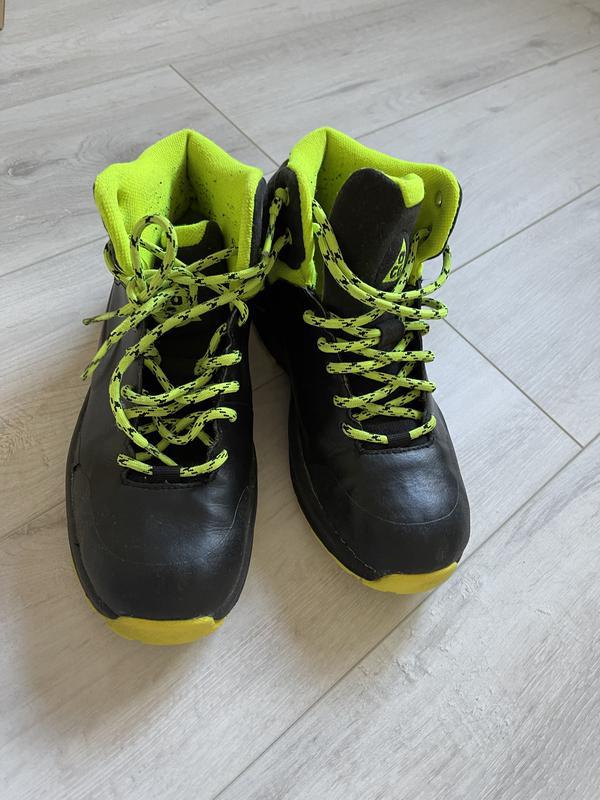 Размер -37,5 Практичные детские ботинки от Nike. Модель выполнена из натуральной и синтетической кожи черного цвета и дополнена вставками из неоново-зеленого текстиля. Детали: функциональная шнуровка, логотип бренда сбоку, внутренняя отделка из дышащего текстиля, удобная рельефная подошва.