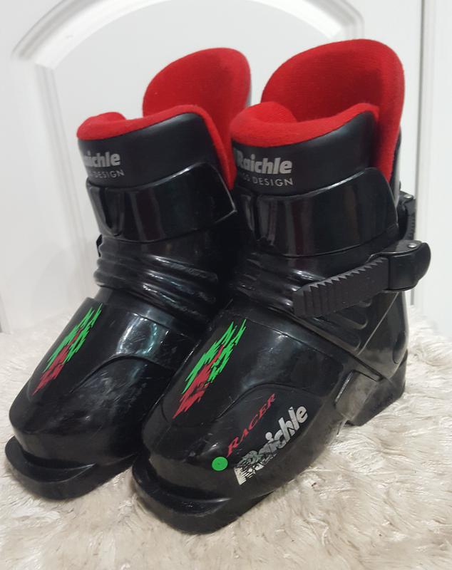 Детские лыжные ботинки чёрного цвета с одной клипсой-застёжкой сзади от швейцарской обувной компании Raichle,которая уже почти сто лет производит специальную горнолыжную обувь. За этот период компания прошла большой путь и получила широкое мировое признание. Основополагающая концепция компании - выпуск техничной, функциональной обуви для альпинизма , туризма и спорта. В разных странах мира обувь Raichle ежегодно отмечают как продукцию высочайшего качества и надежности. Длина стельки 17.3см