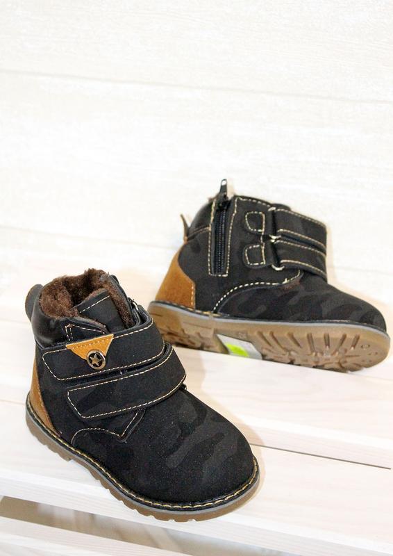 Детские зимние ботинки для мальчика Камуфляж Модные ботинки для самых юных модников. Снаружи ботинки выполнены из экко нубука. Высокий сплошной язычок защищает от попадания снега и влаги. Надевать такие ботинки - секундное дело, ведь помимо двух липучек в них есть ещё и молния сбоку. Подошва выполнена из термопластичной тракторной подошвы. В такой обуви ребенок будет чувствовать себя удобно и надежно. Размер: 22 ― 13,5; 23 ― 14; 24 ― 14,5; 26 ― 15,5