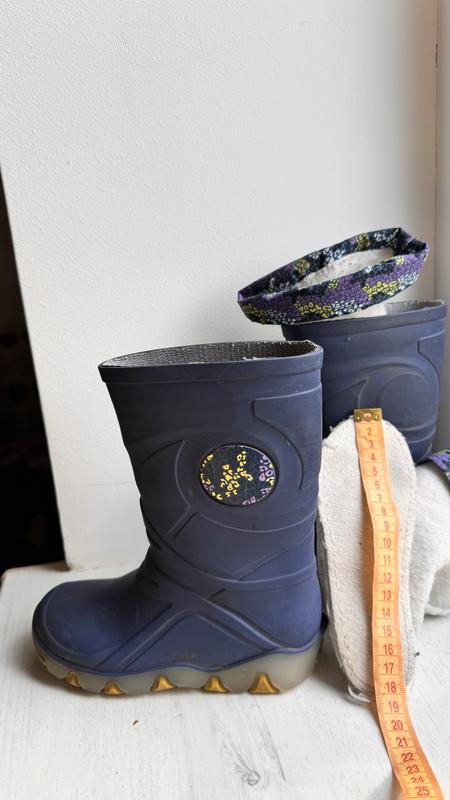 Резиновые с мерцающей подошвой в хорошем состоянии есть утепленные чехлы, по стельке длина 17,5