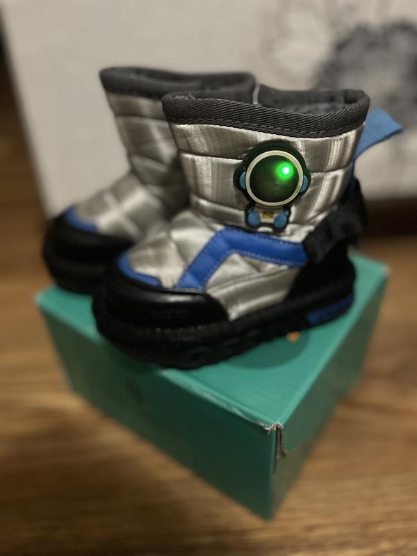 Зимние ботинки, теплые, очень мягкие внутри. Эффекты видны на фото, других нет. Замки работают, при ходьбе светятся Размер 21 (13,5 стелька)