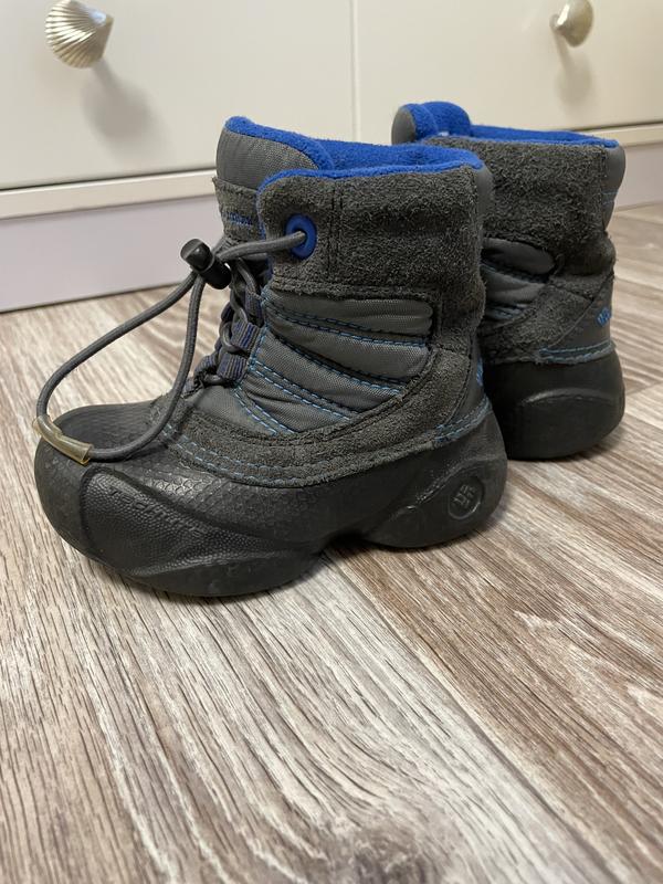 Фірмові, в дуже хорошому стані, тепленькі і не промокаємі. Розмір 21,5. Єдиний нюанс - треба замінити шнурки-резинки (за потреби), ми доношували так, на функціональність не впливає