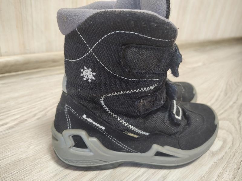 Теплые зимние сапоги. Сзади светоотражающая нашивка. Застегиваются на 3 липучки, что удобно надевать на детскую ножку, особенно, капризного мальчика..Размер указан 33, но можно и на меньше, поставив дополнительно стельку. Есть нюанс на одном сапоге, малый постоянно цеплял ногой санки, а затем еще и пальчиком искал, что там внутри. Поэтому в самой верхней части левого сапога повреждения ткани, что совсем не уменьшает их теплоизоляционные свойства. Мембранные, с технологией Gore Tex-не промокаемая, но дышащая ткань. Подошва тракторная, не скользкая. Как мамакажу, что они очень теплые и удобные.