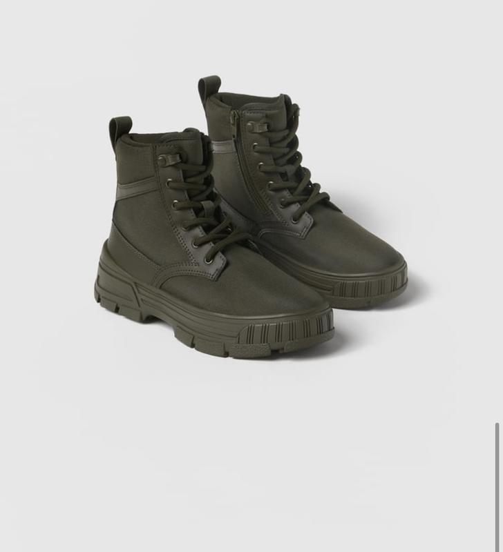Осінні ботінки в кольорі хакі, в мілітарі стилі, від фірми Zara, розмір 31. Ботінки з міцного текстилю. Дуже стильні, обʼєм регулюється шнурівками, для зручності взування мають замок. Устілка 20 см. Стан: ідеальний.