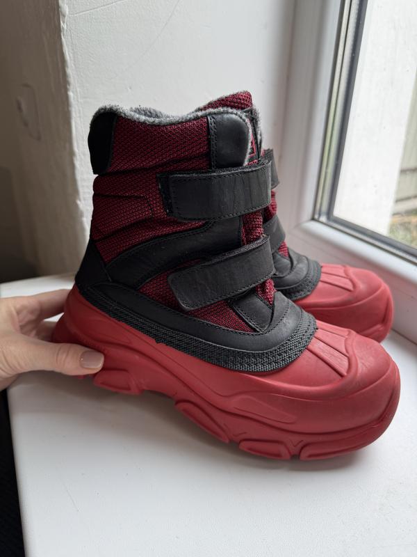 Зимові чобітки від бренду Minimen. Утеплені овчиною(устілка не виймається), легенькі,з льодоступами.Лита гумова підошва та носок,що дуже круто на мокру погоду.На липучках.Підходять на високий підйом та широку ногу. Дитина носила зовсім мало тому стан ідеальний. Розмір повномірний 32/33