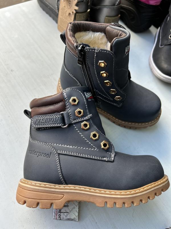 Зимові ботінки для хлопчика на цегейці(овчині) . Водонепроникні, теплі, підошва не ковзає. Може бути на високий підʼйом. Відсутня шнурівка( потрібно буде докупити, або з старих черевиків). Дуже теплі.