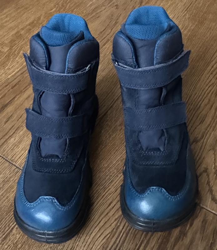 Оригінальні зимові чоботи Ecco розмір 33, устілка повсть 21 см. На двох міцних липучках. Матеріал верху - замша + плащівка. Колір - темно-синій. Мембрана Gore-tex, не промокають. В гарному стані.