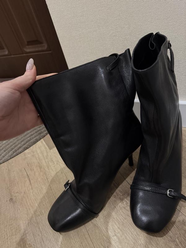 Елегантні чорні ботильйони ZARA Оригінал, розмір 40. Натуральна шкіра. У хорошому стані, є незначні сліди носіння, без серйозних дефектів. Стильний каблук, акуратний носок, декоративні ремінці додають елегантності. Зручні та універсальні як на щодень, так і під класичні образи.