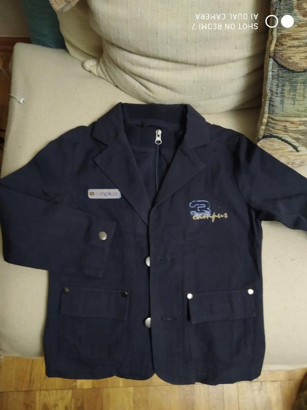 Піджак з трикотажною вставкою на молнії , яка кріпиться на гудзиках. Коли холодно вставка гарно прикриє груди. Катон матеріал піджака,трикотажна вставка бавовна. На зріст 110/116см, 4-6років.
